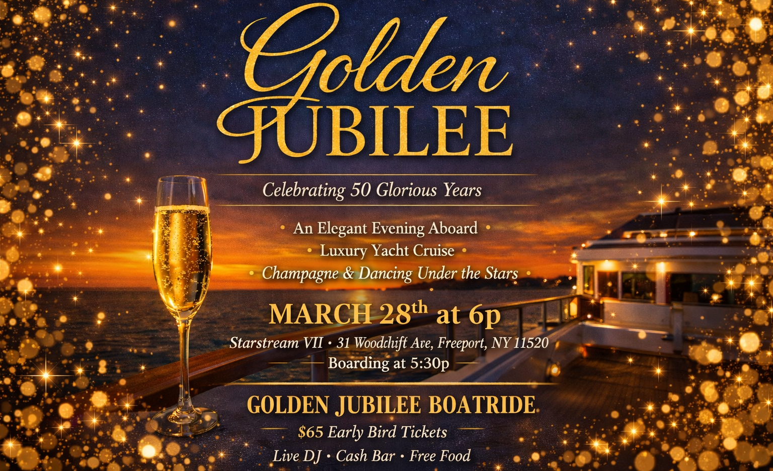 Celebrate in style as we set sail for an elegant evening on the water. Join us aboard the Starstream VII for a sophisticated sunset cruise honoring a Golden Jubilee. Enjoy great music from a live DJ, complimentary food, and a fully stocked cash bar as you dance and mingle under the stars. This unforgettable boatride promises beautiful views, great vibes, and a memorable night of celebration, elegance, and smooth sailing.